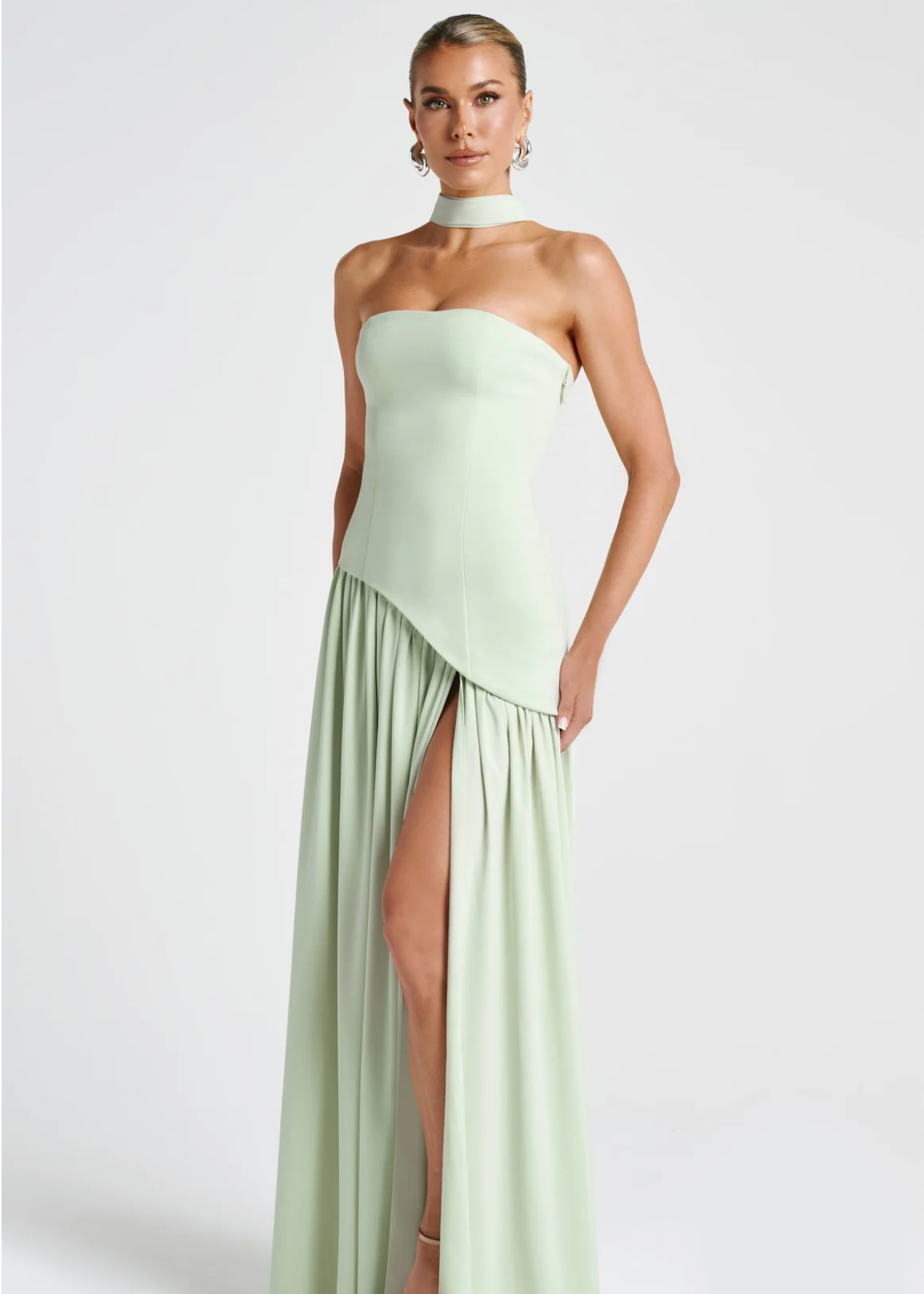 Son bustier sans manches met en valeur les épaules et le décolleté, tandis que sa longue fente sur la jambe apporte une touche glamour irrésistible. Une coupe pensée pour conjuguer audace et élégance.