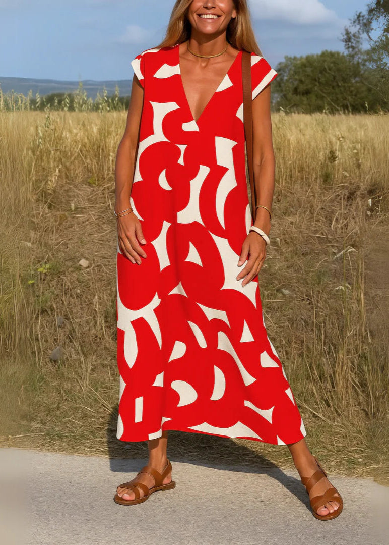Avec son imprimé graphique audacieux et sa coupe ample, cette robe longue est une invitation à la liberté et au confort. Son encolure en V et ses manches courtes lui donnent une allure décontractée et moderne, idéale pour les journées d'été ou les escapades en bord de mer.