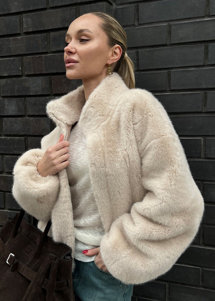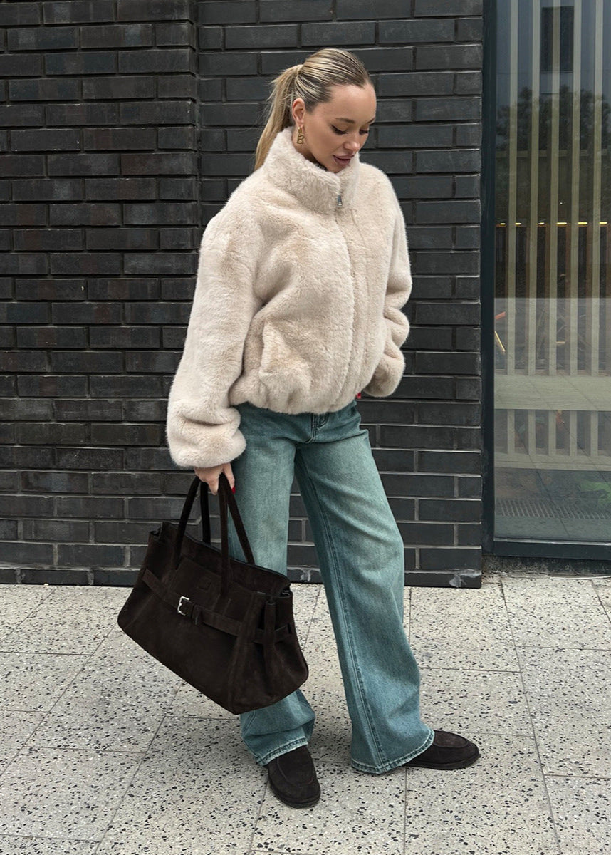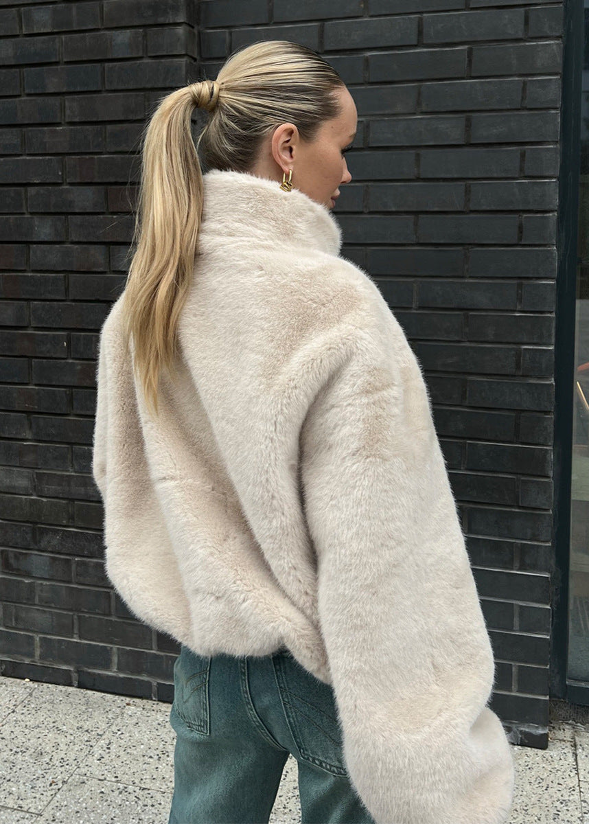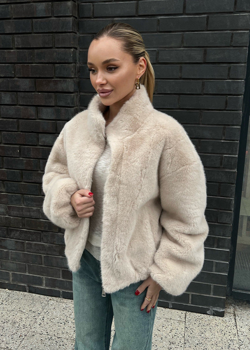 Ajoutez une touche de chaleur et de douceur à votre dressing avec cette veste en fausse fourrure beige. Sa texture ultra moelleuse apporte un confort incomparable tout en donnant une allure élégante et moderne.